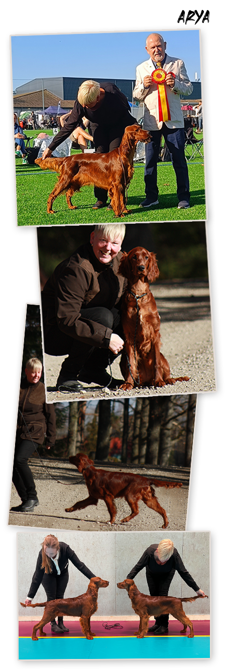 Efter ytterligare en vända i Eskilstuna där hon blev bästa tikvalp igen så var vi med på påskutställning i Hackvad Hundhall. Där fick hon en jättefin kritik och avslutade dagen med en tredjeplats i BISvalp-finalen! I slutet av april var det dags för SKK-premiär i Rocklundahallen, Västerås. Över 2000 hundar anmälda och trettiotalet settrar. Arya blev bästa tikvalp och en kritik man verkligen kan vara stolt över. I mitten av maj fick hon sin andra BIS-valprosett , på Örebro läns kennelklubbs inoff i Kvinnersta. Den här gången blev det en andraplacering.